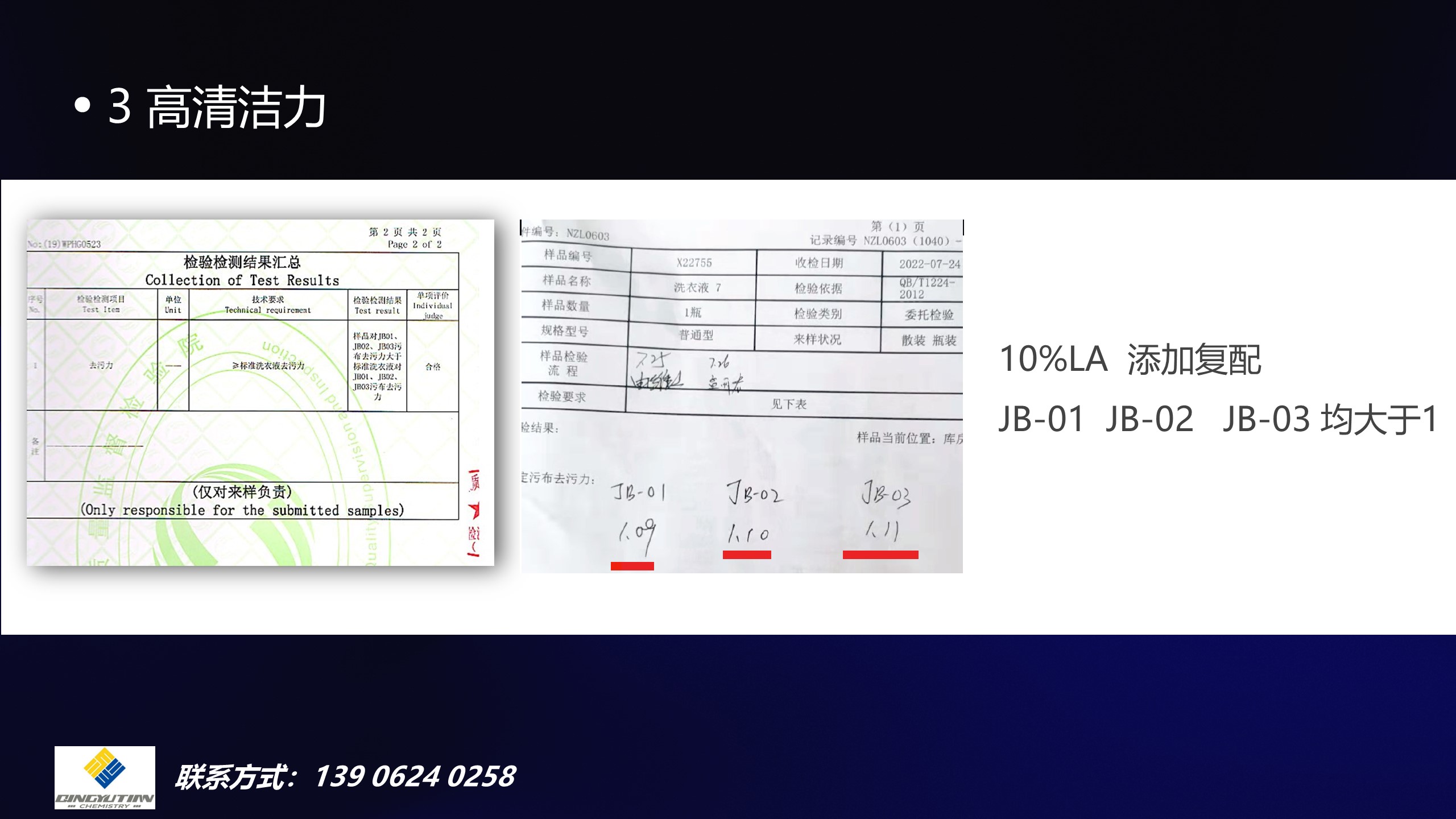 月桂酰丙氨酸衍生物30%水溶液清洁力优于传统主表面活性剂,可取代现有主要表面活性剂使用。以月桂酰丙氨酸衍生物30%水溶液作为唯一主清洁剂的洗衣液已通过国家权威检测机构的清洁力测试(国标污布 JB01、JB02、JB03)。不仅清洁性能优异,且其配制的清洁产品极易漂洗。