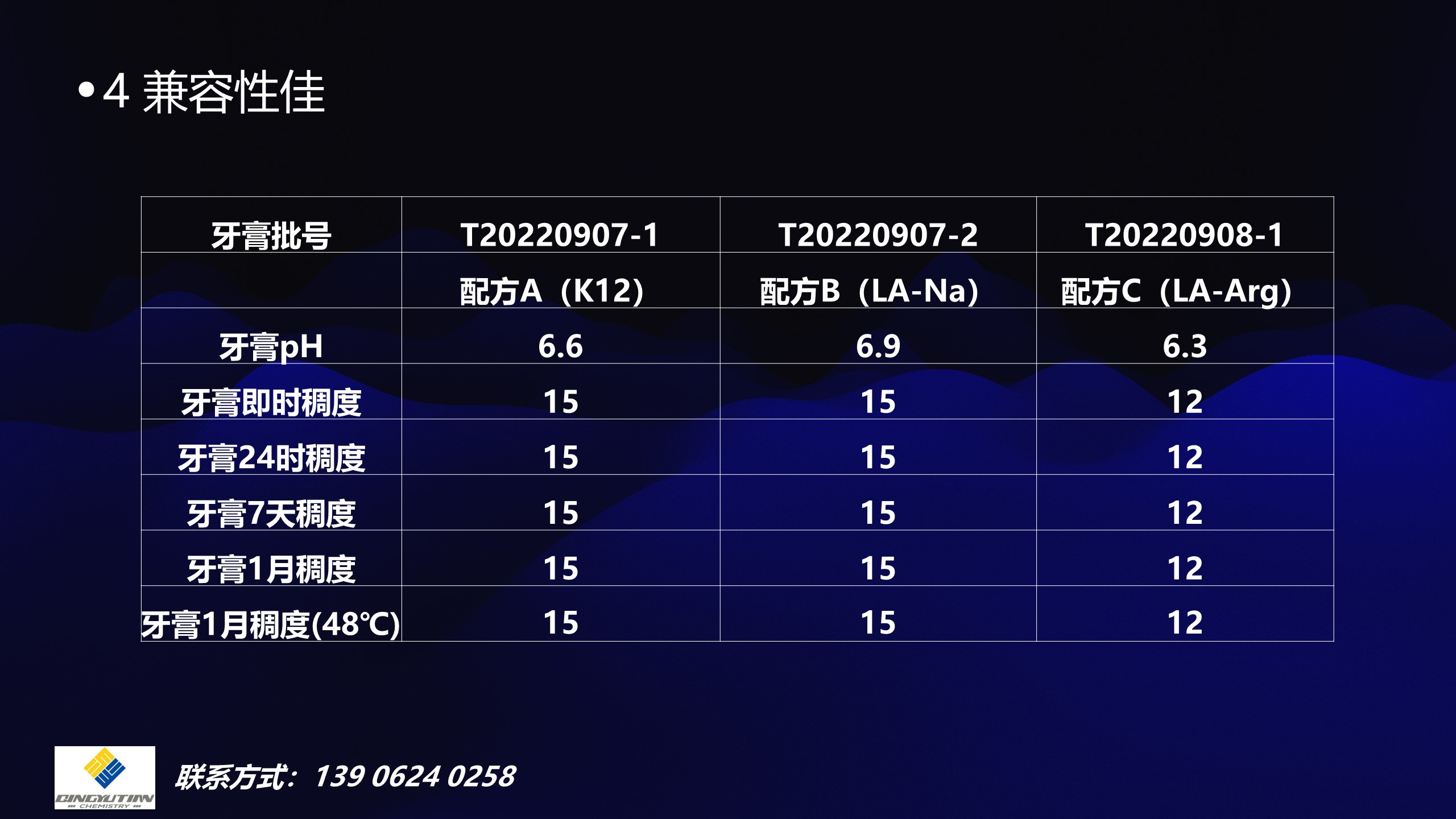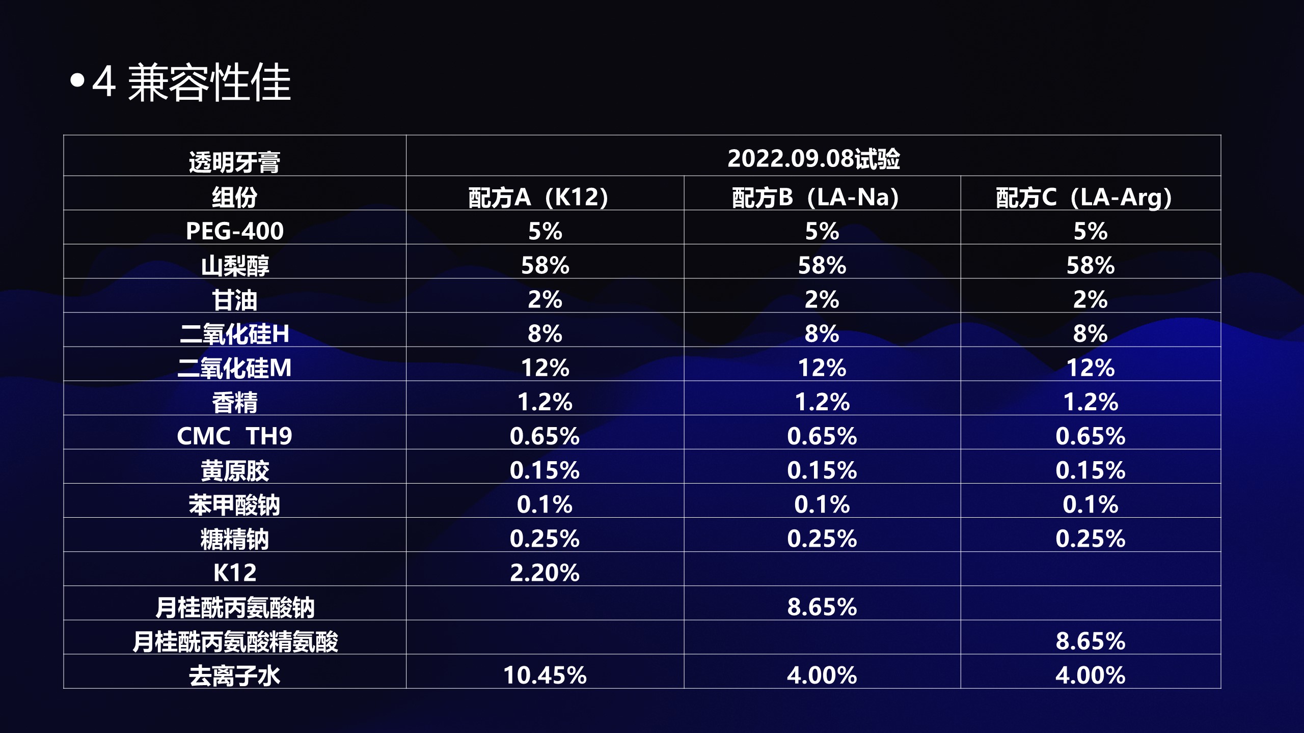 由于月桂酰丙氨酸不溶于水,所以需要先将其制备成钠盐或精氨酸盐30%水溶液,然后加入牙膏体系中,在牙膏中按现有配方移去K12,调整水量,加入上述配制月桂酰丙氨酸衍生物30%溶液2~5%(按月桂酰丙氨酸100%计)